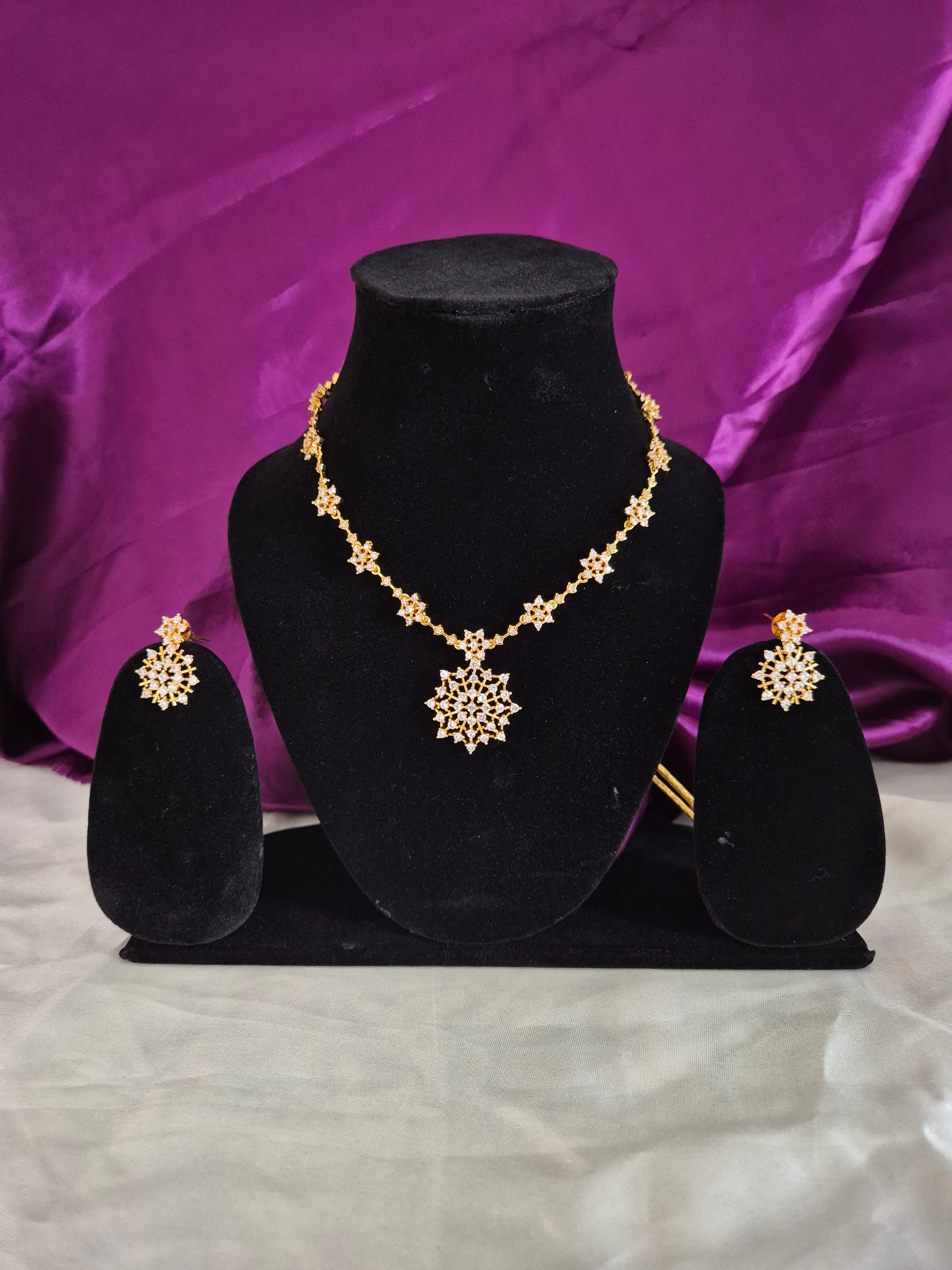 Elevate your elegance with this stunning AD white stone gold-plated necklace and earrings set. Crafted with intricate detailing, the necklace features a timeless design. Paired with matching earrings, this set exudes a regal aura perfect for weddings, festive occasions, or any special celebration. The rich gold finish adds a luxurious touch. Make a statement of timeless beauty with this exquisite set, designed to complement your most treasured moments.