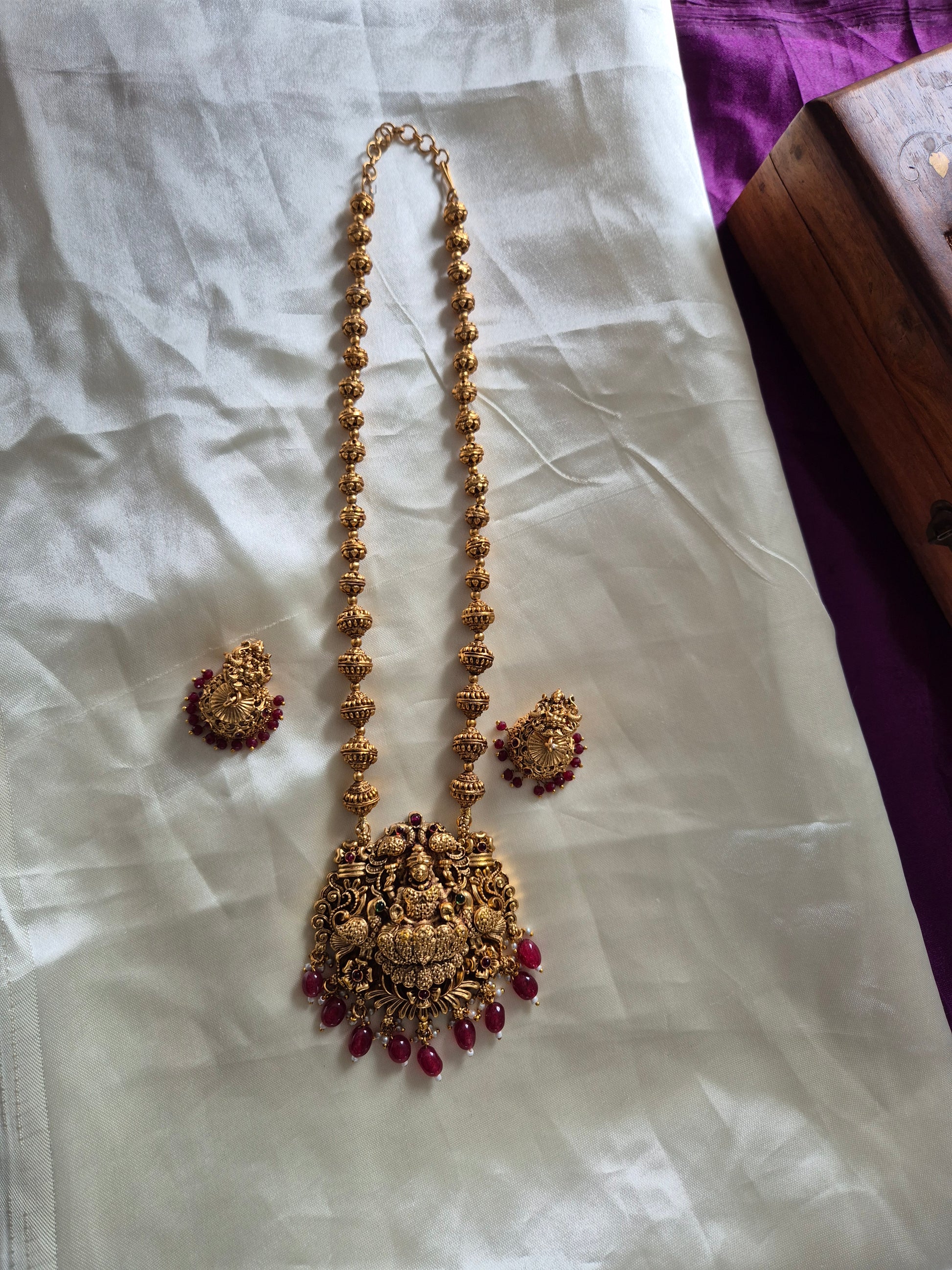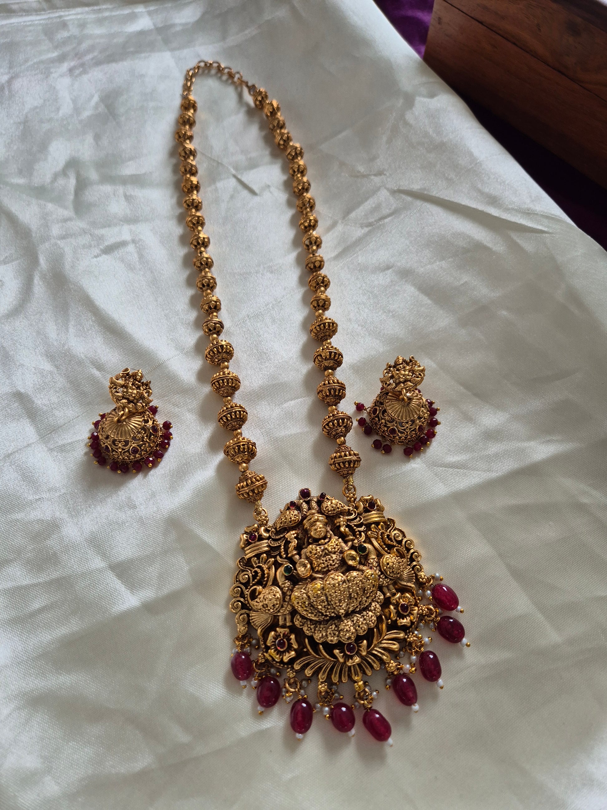 Elevate your elegance with this stunning traditional beaded chain devi haram with ruby beads hangings and jhumkas. Crafted with intricate detailing, the haram features a timeless design. Paired with matching jhumkas, this set exudes a regal aura perfect for weddings, festive occasions, or any special celebration. The rich finish adds a luxurious touch. Make a statement of timeless beauty with this exquisite set, designed to complement your most treasured moments.
