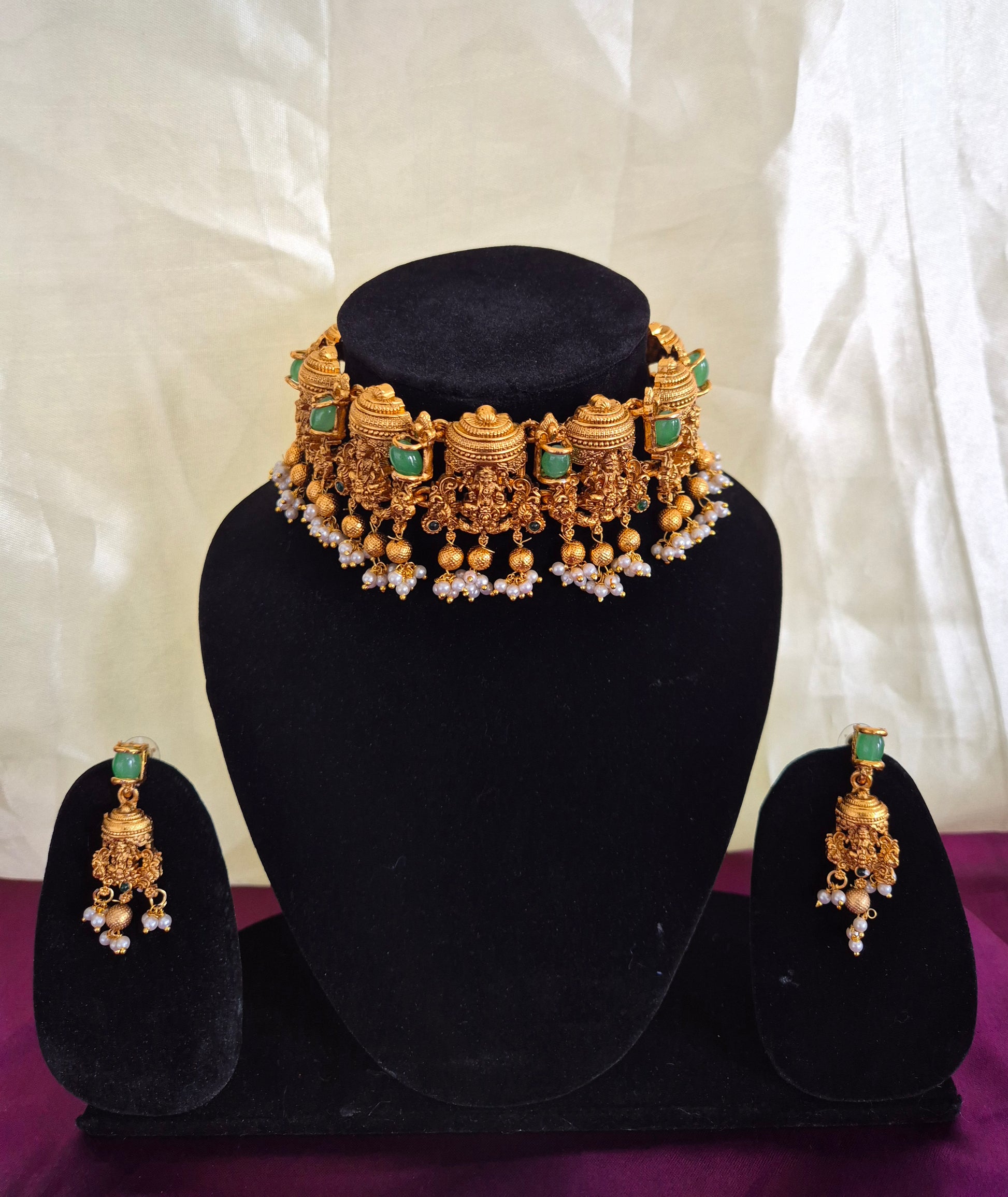 Elevate your elegance with this stunning bridal high neck choker and earrings set. Crafted with intricate detailing, the choker features a timeless design. Paired with matching earrings, this set exudes a regal aura perfect for weddings, festive occasions, or any special celebration. The rich finish adds a luxurious touch. Make a statement of timeless beauty with this exquisite set, designed to complement your most treasured moments.