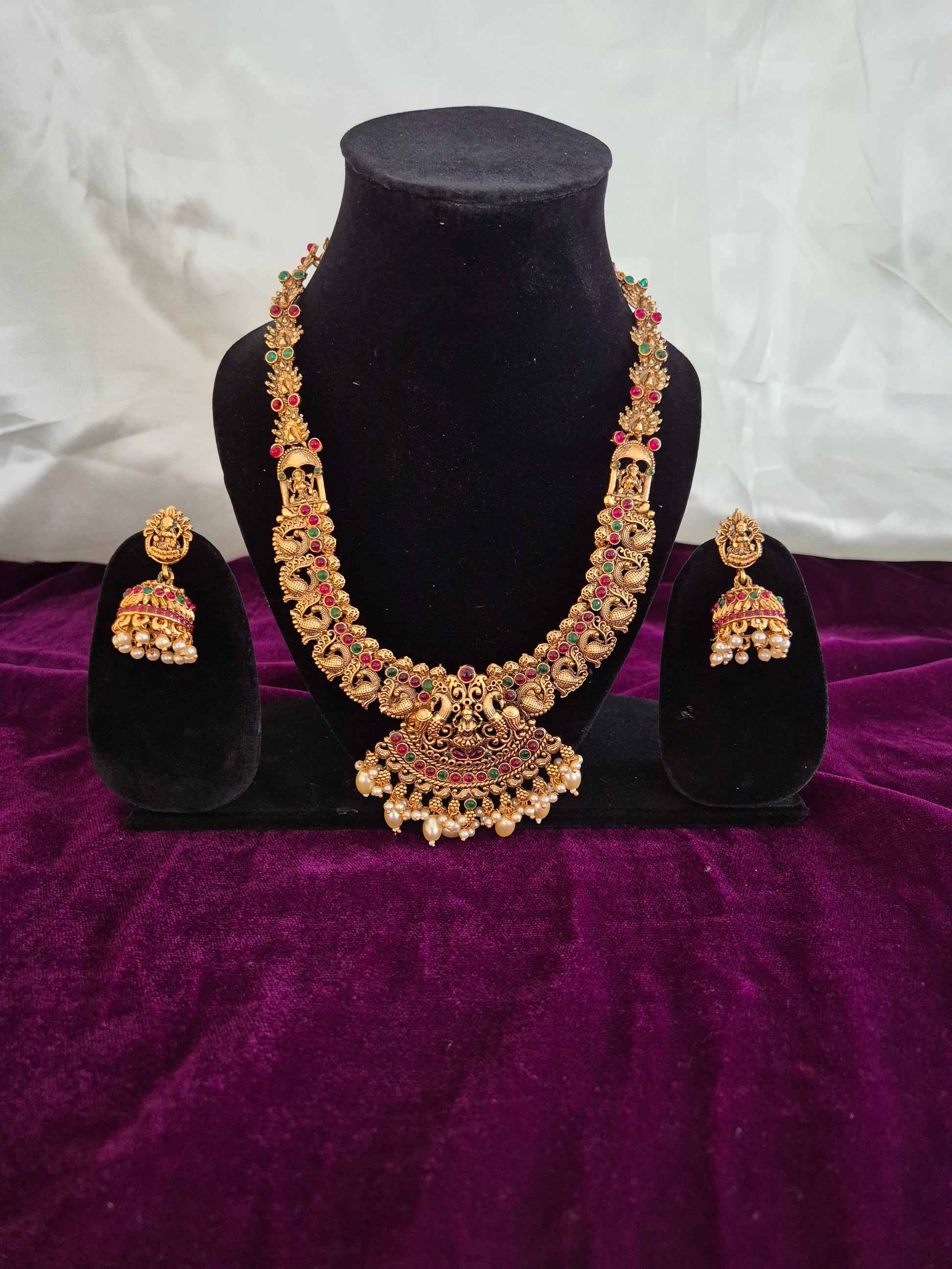 Elevate your elegance with this stunning traditional kemp lakshmi design bridal long haram with pearl hangings and earrings set. Crafted with intricate detailing, the haram features a timeless design. Paired with matching jhumkas, this set exudes a regal aura perfect for weddings, festive occasions, or any special celebration. This set adds a luxurious touch to your final look. Make a statement of timeless beauty with this exquisite set, designed to complement your most treasured moments.
