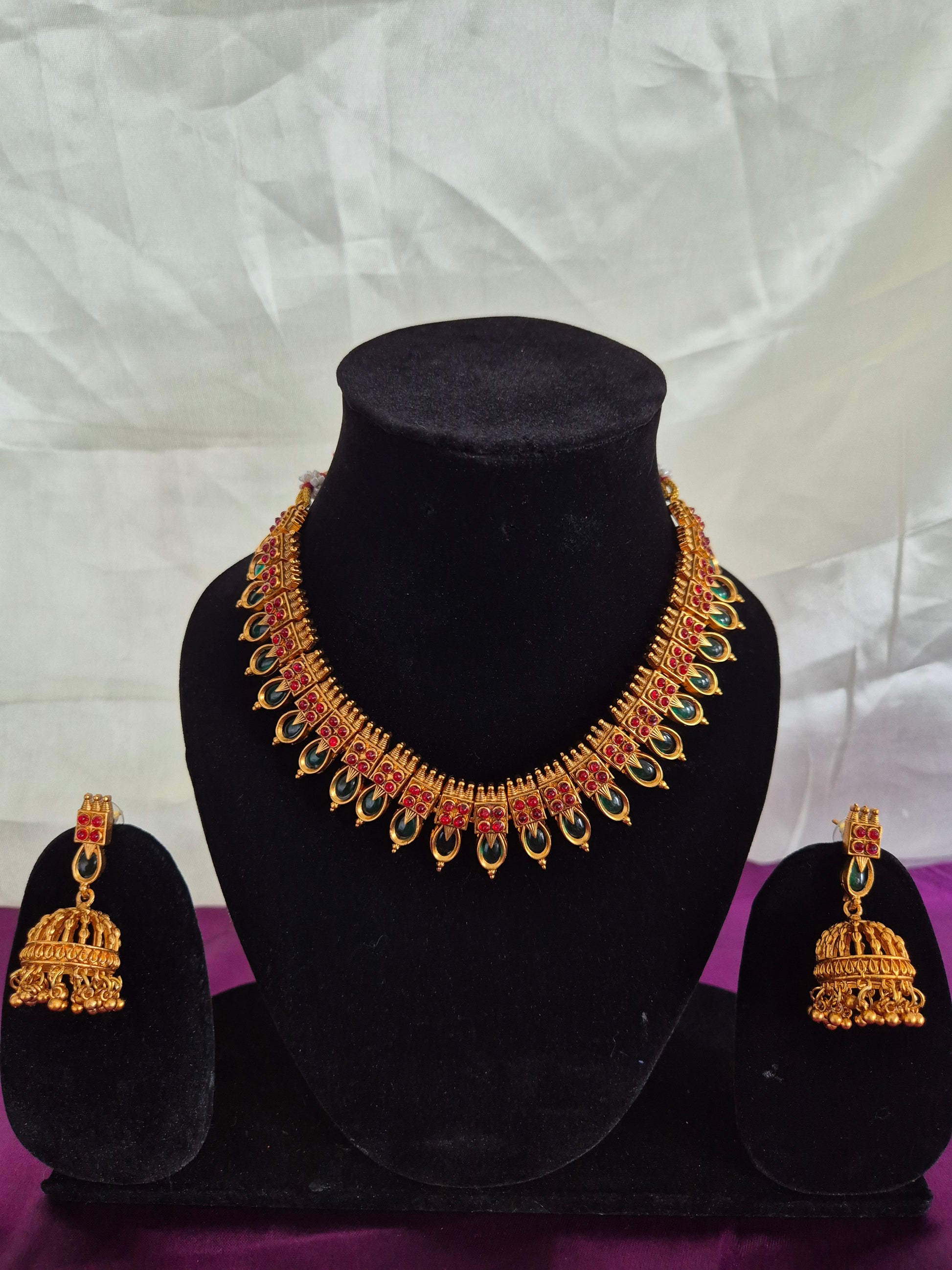 Elevate your elegance with this stunning traditional nagapadam palakka mala and earrings set. Crafted with intricate detailing, the necklace features a timeless design. Paired with matching earrings, this set exudes a regal aura perfect for weddings, festive occasions, or any special celebration. The rich finish adds a luxurious touch. Make a statement of timeless beauty with this exquisite set, designed to complement your most treasured moments.