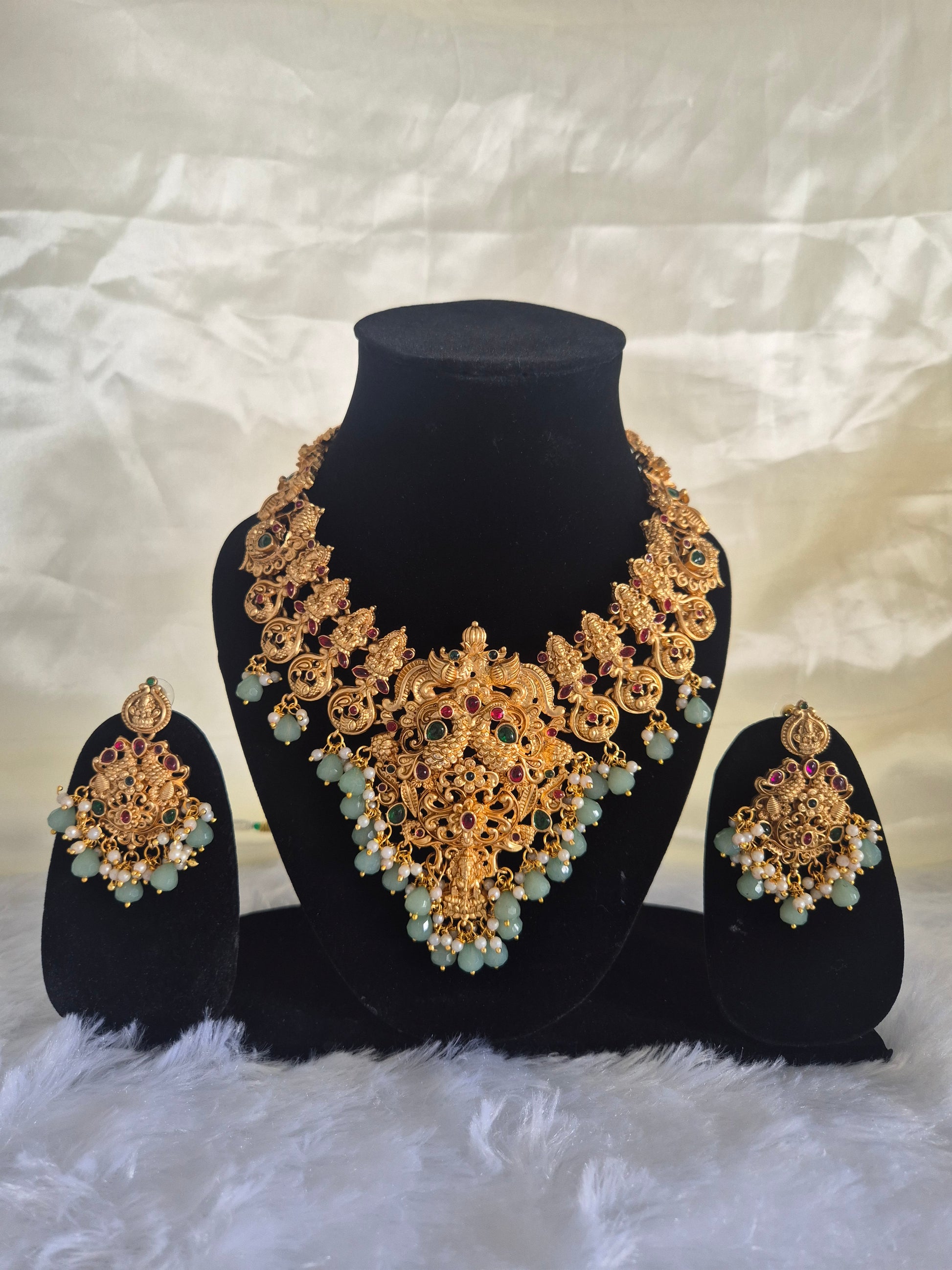 Elevate your elegance with this stunning traditional nakshi temple necklace with red and green stones, as well as hanging pearls and green beads and earrings set. Crafted with intricate detailing, the necklace features a timeless design. Paired with matching earrings, this set exudes a regal aura perfect for weddings, festive occasions, or any special celebration. The rich finish adds a luxurious touch. Make a statement of timeless beauty with this exquisite set, designed to complement your most treasured moments.